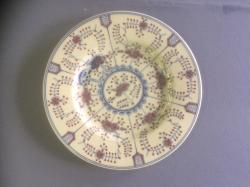Keménycserép. Tányér. A vajszínű alapmázon kézzel festett kékes-lilás geometrikus minták. Alján jelzett, mázra nyomott kék, fonottas szív alakú pecsét, Zsolnay Pécs