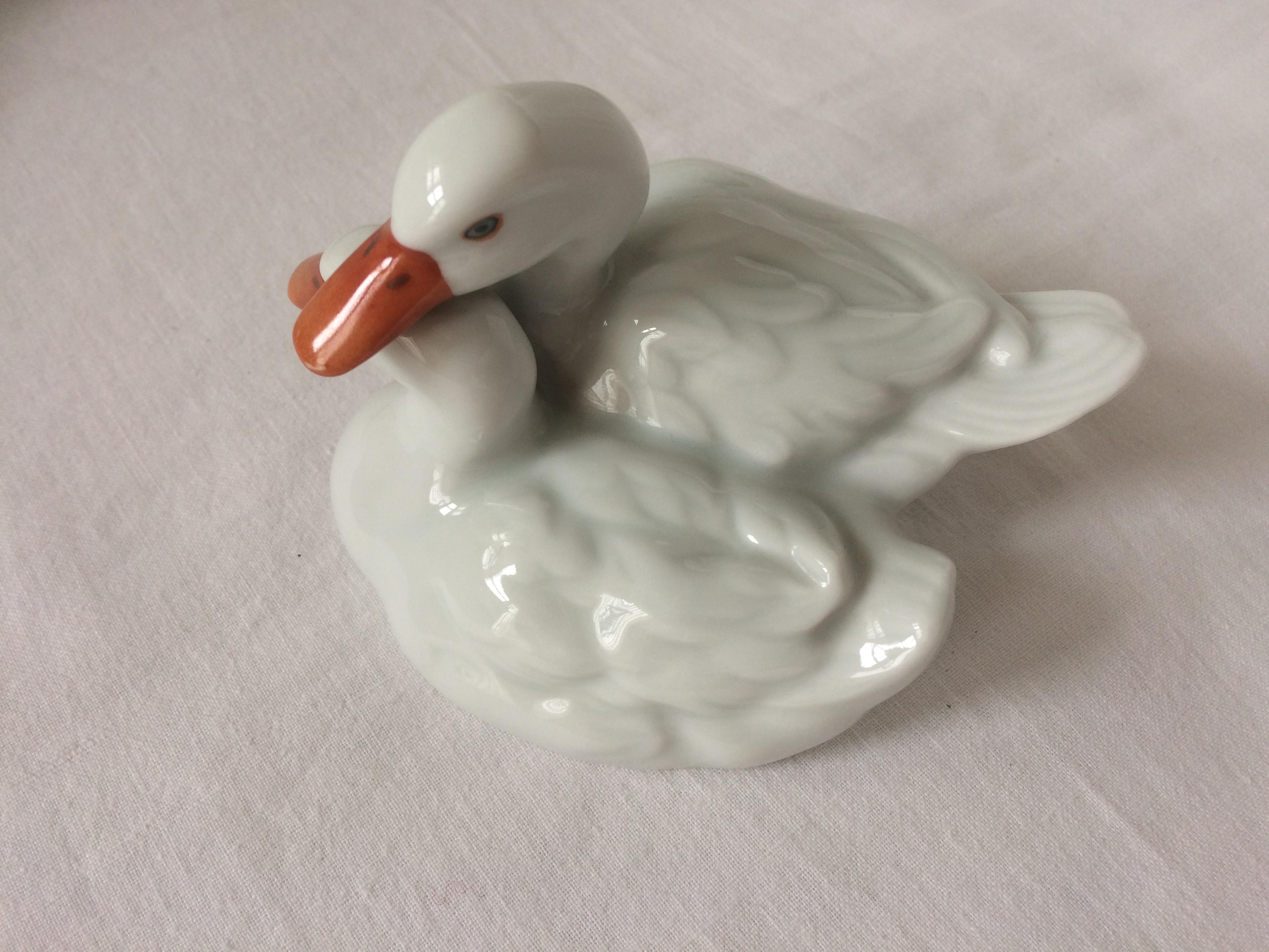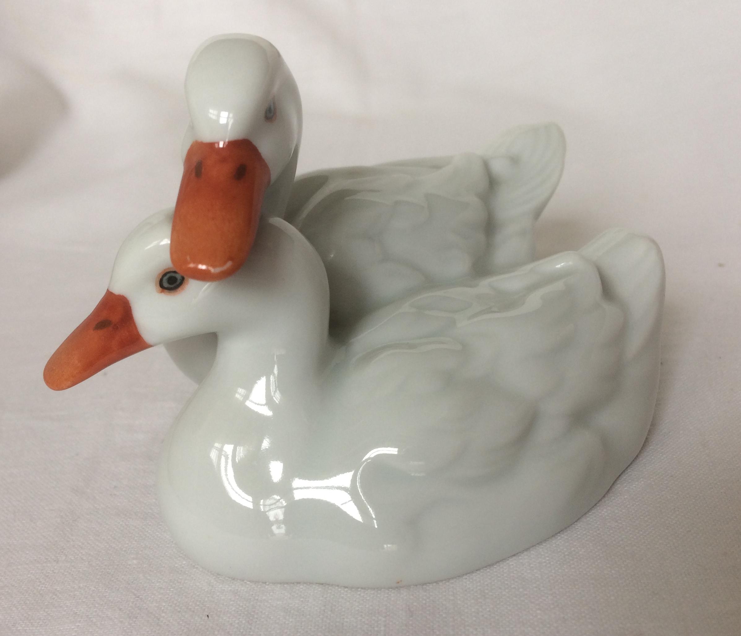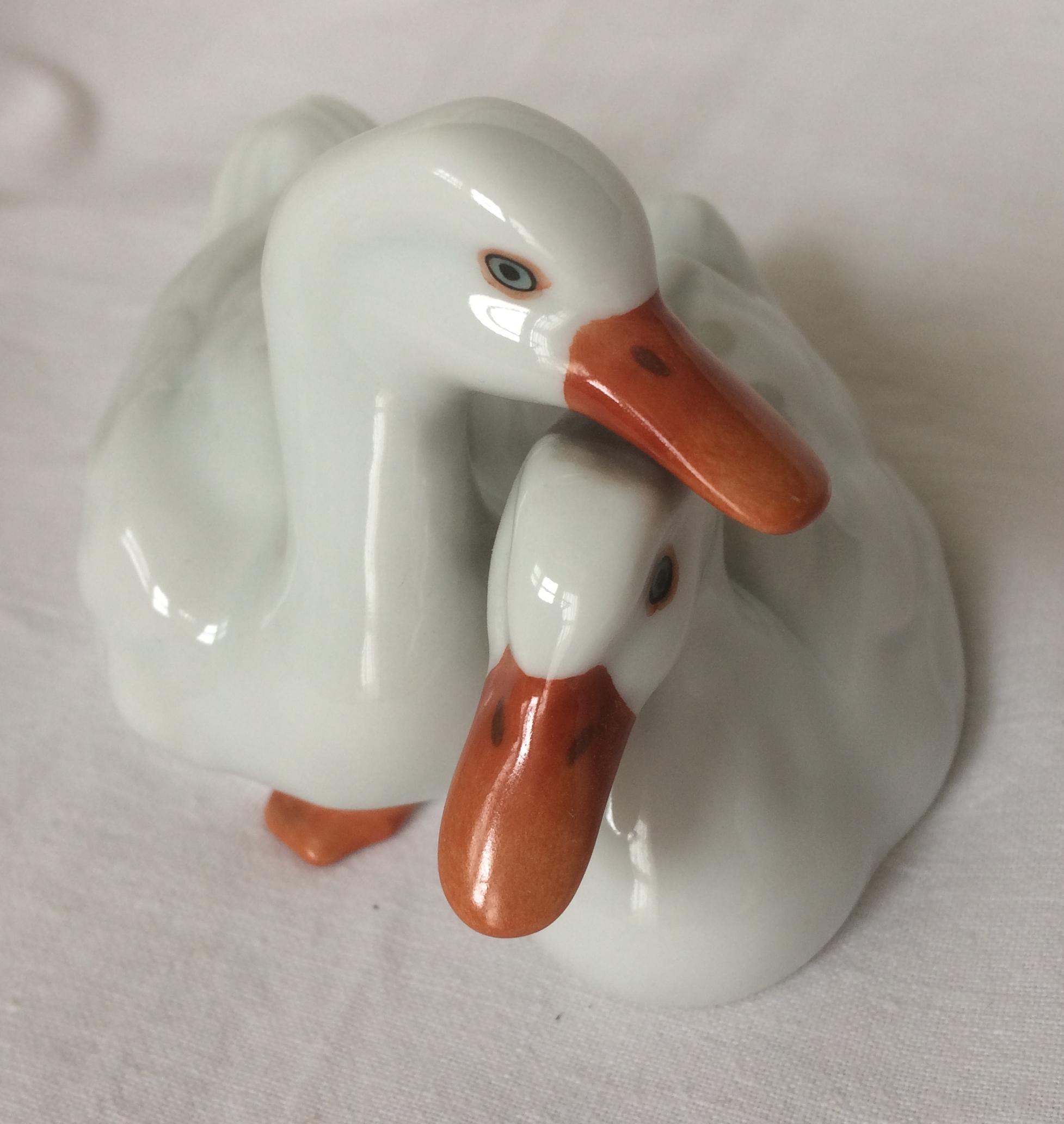 Porcelán. Fehér ülő kacsapár figura. Alján jelzett, mázra nyomott HEREND, Hungary, kék címer pecsét, mázba is benyomva.