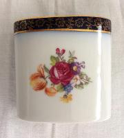| Rövid leírás: | Porcelán. A fehér alapmázon színes virág minta. Felül kobalt - aranyfestés. Alján jelzett, mázra nyomott koronás PM jegy, Made in GDR felírás és azonosító számok. |