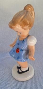 | Rövid leírás: | Mázas kerámia. Bodrogkeresztúri kerámiagyár terméke. Sétáló kislány, kék ruhás, katicabogaras figurális kerámia. Jelzés nélkül. |