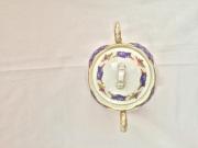 | Rövid leírás: | Porcelán fajansz. A fehér színű alapmázon kék színű francia mintás és virág kompozíciók. Alján jelzett, mázra nyomott kék öttornyú pecsét, Zsolnay Hungary, Pécs |