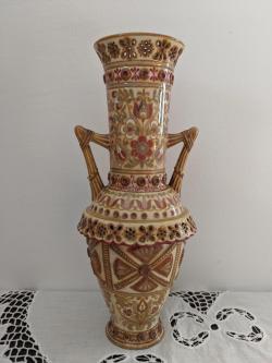 Porcelán fajansz. Zsolnay váza aprólékosan mintázott perzsa? minta, szögletes fülekkel. Alján jelzett, kettős körben , Zsolnay Pécs.
