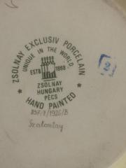 | Megjegyzés: | mázra nyomott öttornyú pecsét, Zsolnay Hungary, Pécs, hand painted felírás, 857/II/1926/B-s jelzés, Szalontay, Zsolnay Exclusive Porcelain |