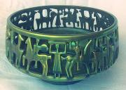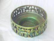 | Rövid leírás: | Porcelán fajansz. Zöldes aranyos, kékes színű eozin mázas kaspó, Kovács István terve, honfoglalás kori motívummal. Alján jelzett, mázra nyomott pajzspecsét öt templom Zsolnay Pécs, made in hungary felírás. |
