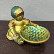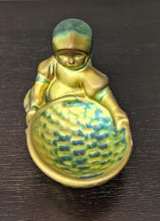 | Rövid leírás: | Porcelán fajansz. Zöldes aranyos, kékes színű eozin mázas szobor, kínáló tálcát tartó Annuska figura, Sinkó. Alján jelzett, mázra nyomott pajzspecsét, öt templom Zsolnay Pécs felírás. |