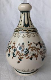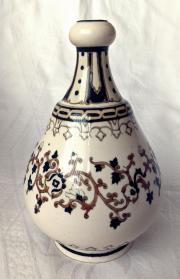 | Cím: | 579. Zsolnay butella, arab-mór mintás, családi címeres, 1880 körüli, 18 cm-es |