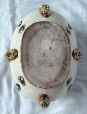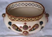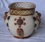 | Rövid leírás: | Porcelán fajansz. Antik Zsolnay PECS Magyarország jelzett, kaspó gyönyörű virágos áttört mintával és festett arany díszítésekkel. Alján jelzett, mázba benyomott Zsolnay Pécs, 1919. |