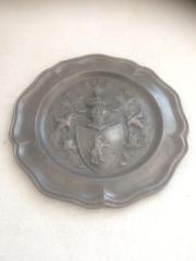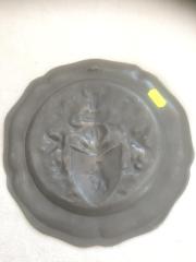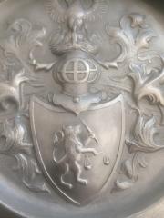 | Rövid leírás: | Ón dísztányér nagyon szépen domborúra kidolgozott címer motívummal, Oroszlán karddal és mérleggel. Súly: 585 gr. Jelzetlen. |