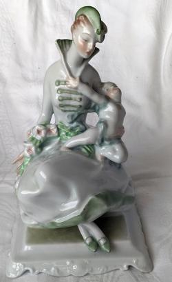 Porcelán. Fehér alapmázon zöld-türkiz színes festés, puttót tartó dáma szobor. Alján jelzett, mázra nyomott Herend Hungary régi címer, handpainted, masszába benyomva Herend 5759 formaszám.