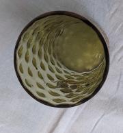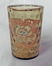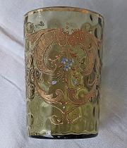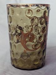 | Rövid leírás: | Zöldes-barnás belülről hólyagos, fújt üvegpohár, szecessziós festett arany és virágmotívumokkal. kopott…emlék felirattal, 19.sz. vége. Talpa csiszolt, de érezhető a fújócső nyoma |